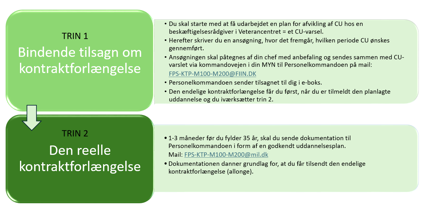 Bemærk, at det er en betingelse for kontraktforlængelse, at medarbejderen har påbegyndt sin godkendte CU FØR det fyldte 35 år (normal kontraktudløb). Og forlængelsen kan kun ske af operative hensyn eller af hensyn til medarbejderens mulighed for at optimere optjent civiluddannelse (CU).